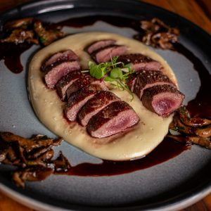 Magret de Pato ao Vinho do Porto, Purê de Mandioquinha, Banana Ouro e Mini Cebola Caramelizada no Capim Santo