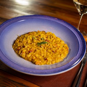 Risoto de Polvo com Açafrão, Parmesão, Tomate Cereja e Dill
