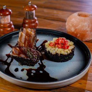 Atum em Crosta de Gergelim, Molho Teriyaki, Arroz Negro, Palmito Pupunha e Tomate