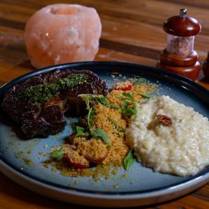 Bife de Ancho Angus, com Risoto de Parmesão e Farofa Crocante