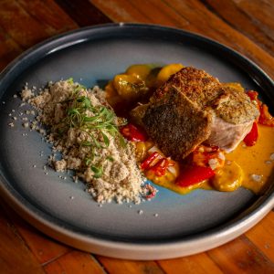 Peixe do Dia na Moqueca de Banana da Terra e Farofa de Coentro