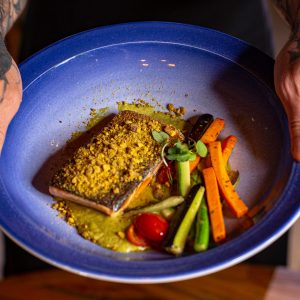 Salmão Grelhado com Mini-Legumes e Creme de Pistache
